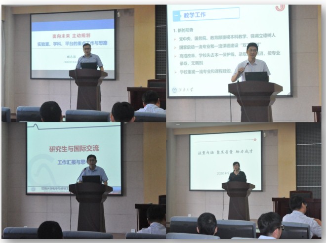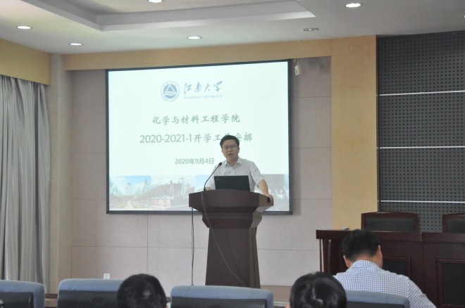 东为富院长对新学期的各项日常工作和四大重点工作进行了安排。东院长提醒了各位老师在教学工作、研究生工作、招生工作、学生工作、科研工作、国际交流和实验室安全等工作中的需要注意的要点,并重点交流了本学期学院的四大重点工作,即全国第五轮学科评估迎评工作、材料科学与工程一级博士点申报工作、合成与生物胶体教育部重点实验室和光响应功能分子材料国际联合研究中心的建设工作,希望全体教职工在新的形势下,认真完成新的任务,做出新的作为!