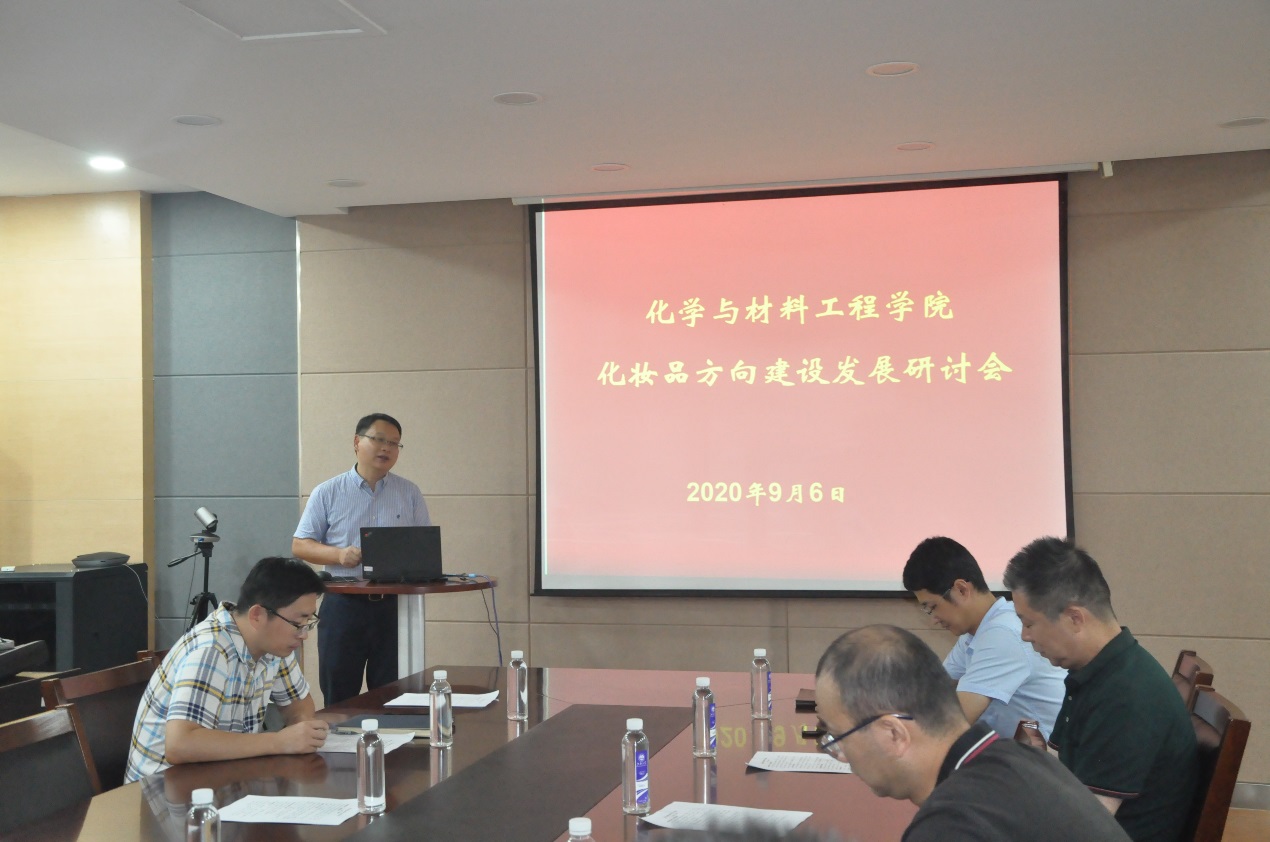 在A310会议室召开化妆品方向专题研讨会,学院党委书记潘庆伟主持,学院党政班子成员、化妆品团队全体老师、大日化中心相关教师代表参加了会议。