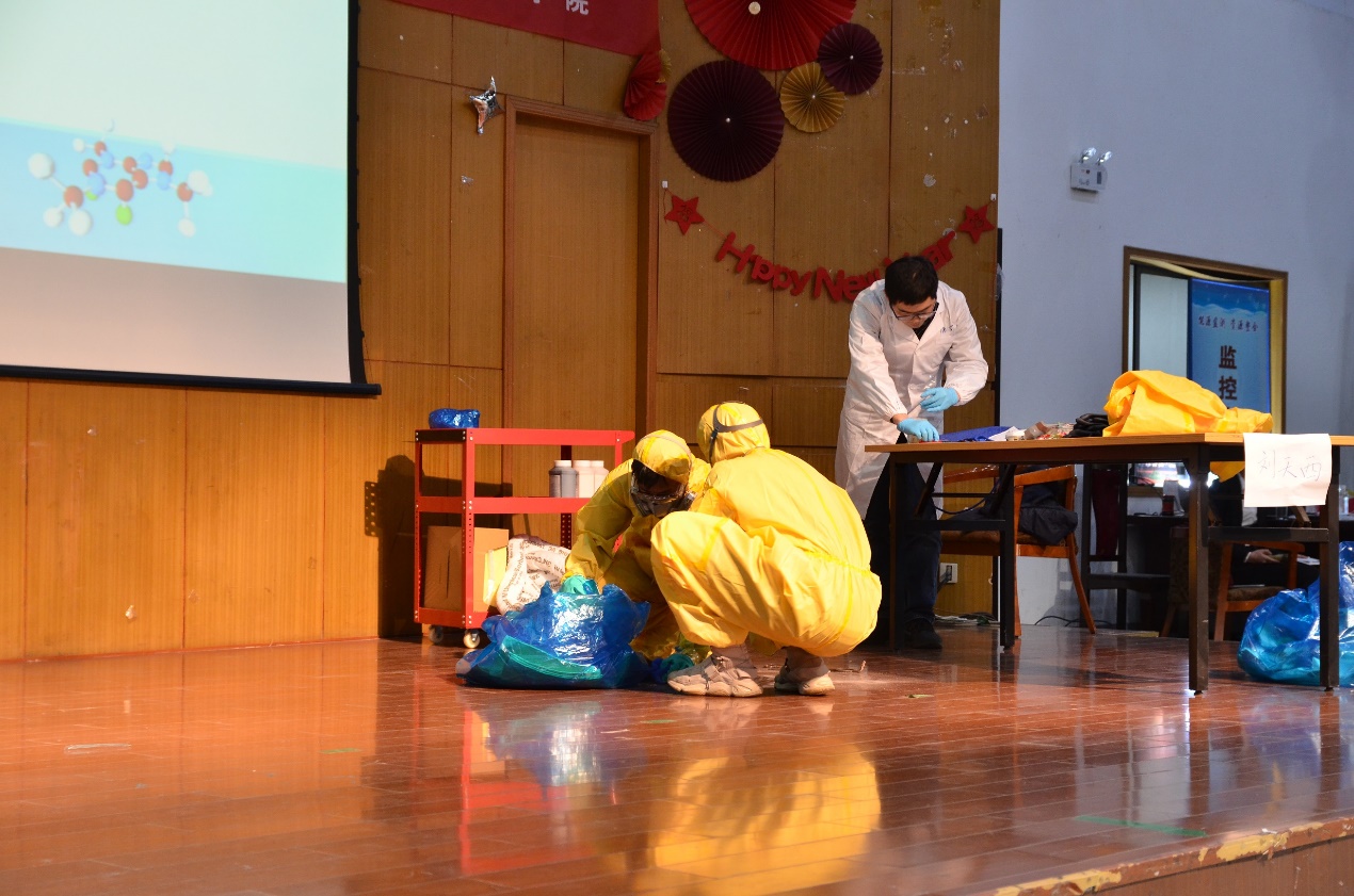 复赛开始前,钱婷婷老师强调了实验室安全的重要性,提醒同学们牢固树立安全意识,在实验室安全问题上,容不得丝毫侥幸心理,并对此次举办的实验室安全知识竞赛对一本道安全意识建立的促动效果表示肯定。在经过两轮激烈的角逐,来自刘天西和杜明亮团队的两支队伍进入总决赛,最后的操作题采用了情景模拟的方式,在舞台上为比赛选手模拟出实验室突发事故的现场,要求学生组成应急小组进行现场操作,从防护服、防护面罩等的穿戴到进入突发现场处理破碎的试剂瓶与地上的“浓盐酸”,在从理论知识走向应急处置的过程中,选手的实际操作存在一些不足与隐患。最终,刘天西团队以更加细致严谨的操作获得了本次比赛的一等奖,杜明亮团队荣获二等奖,许虎君和宋启军团队获得三等奖,东为富和王海军团队获得优胜奖,各评委老师及特邀嘉宾为参赛选手进行了颁奖并合影留念。