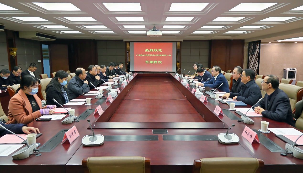 1月22日上午,广州市白云区委书记赵军明、区委副书记潘志军、副区长蔡胜以及白云区各部门主要负责人一行15人来校推进“一本道