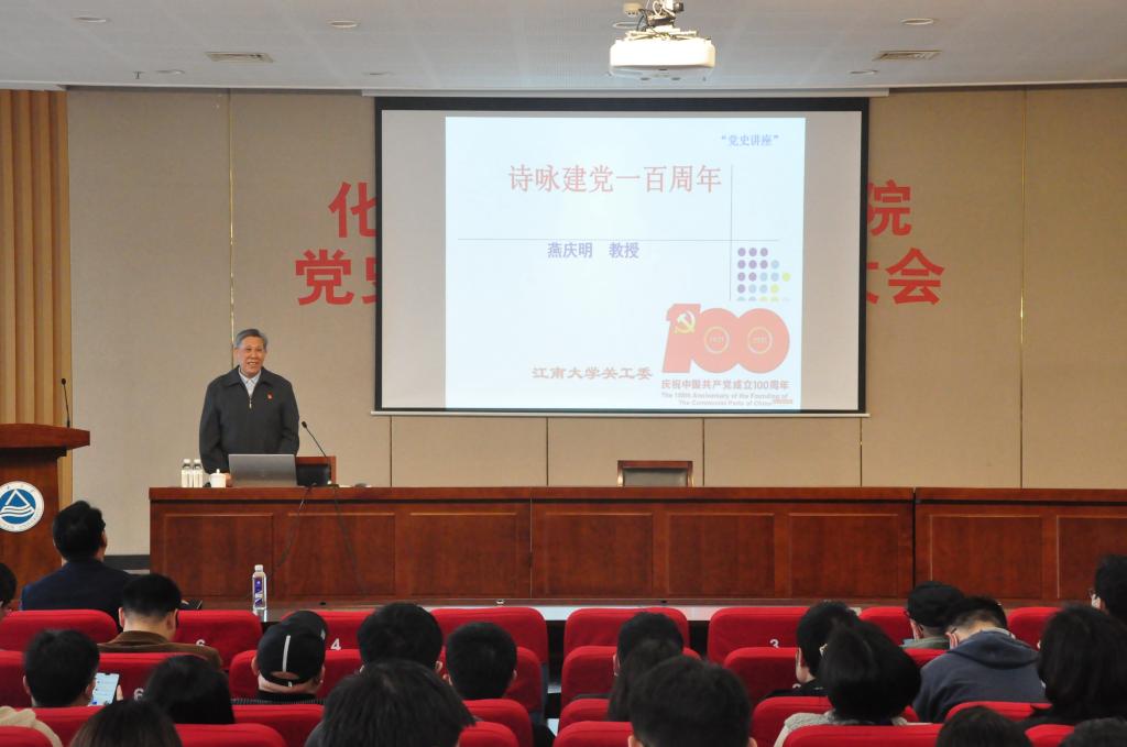 副校长、校关工委燕庆明教授以“诗咏建党一百周年”为题讲授。燕庆明结合自身学习心得感悟以及工作生活经历,通过20余首自创诗词将南昌起义、遵义会议、长征、延安岁月、抗日救国、第一颗原子弹爆炸成功等一件件历史事件娓娓道来,生动鲜明地讲述了中国共产党人在白色恐怖中寻找救国图存答案、革命斗争中筚路蓝缕、十四年抗战中发展壮大、解放战争中辉煌胜利、改革开放中摸索过河以及中国特色社会主义建设进入新时代以来的伟大成就等历史和现实实践。“理论决定方向,道路决定命运,制度决定成败,文化决定精神,坚定“四个自信”,乘风破浪前进。”随着燕庆明老同志饱含激情的总结,讲座在热烈的掌声中结束,现场师生无不为老同志的这堂课喝彩,为在这堂课上汲取到的前进力量和奋斗激情而信心满满。