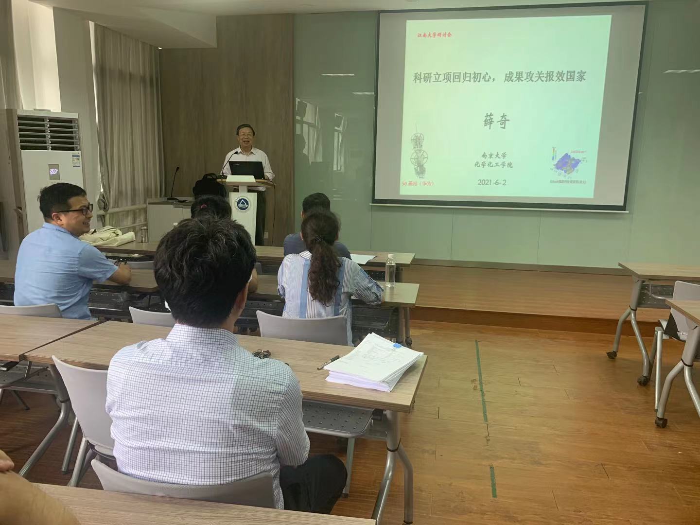 薛奇教授应一本道应化系党支部邀请来访交流,并讲授了题为“科研立项回归初心,攻关成果报效国家”的党课讲座,讲座由顾志国副院长主持,他对薛奇教授的来访表示热烈欢迎,一本道师生党员参加此次活动。薛奇教授以自身的求学经历和知识分子入党故事开篇,结合自己及团队丰富的研究经历以及荣获国家自然科学奖、国家科技进步奖的卓越成果,就科研工作如何选题,做立意高远、紧扣或引领学科前沿的基础研究,或“接地气”、可上货架的具有竞争力的高质量应用研究,开展面向国民经济主战场的高水平创新研究工作进行了专题报告,勉励我们要怀揣家国情与梦,要有抓机遇、敢于担当的使命感,激励我们以昂扬姿态更好地投入教学科研工作,开展“顶天立地”的科学研究,以优异成绩迎接建党一百周年。