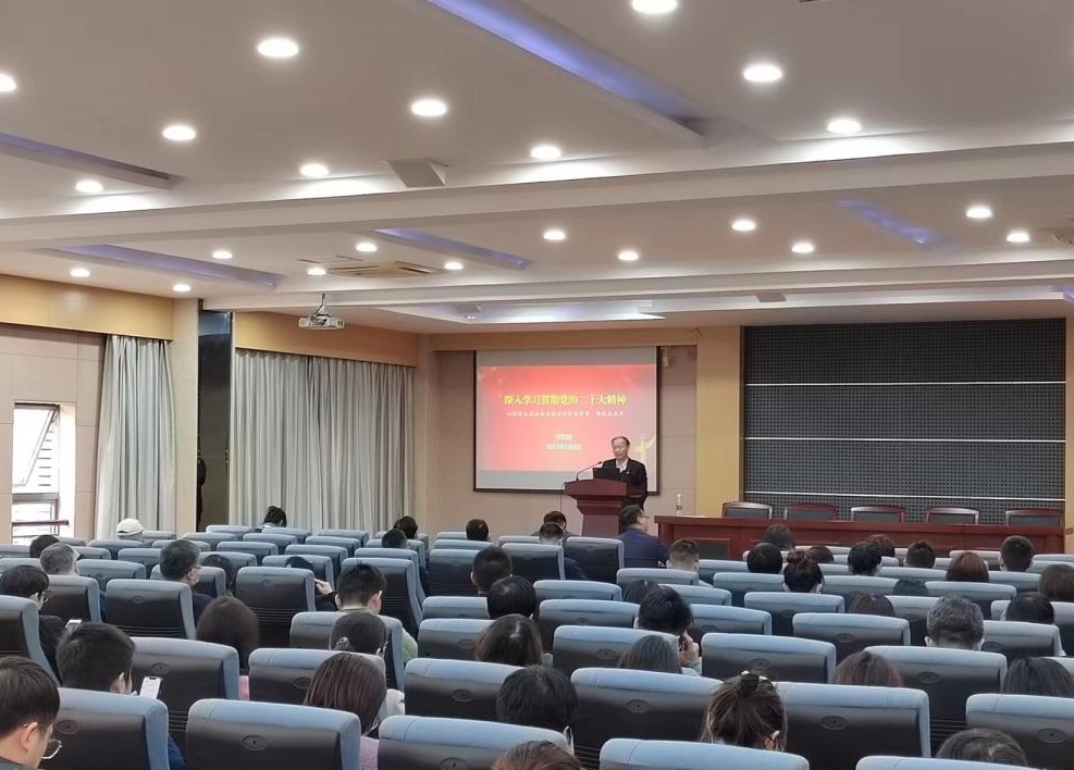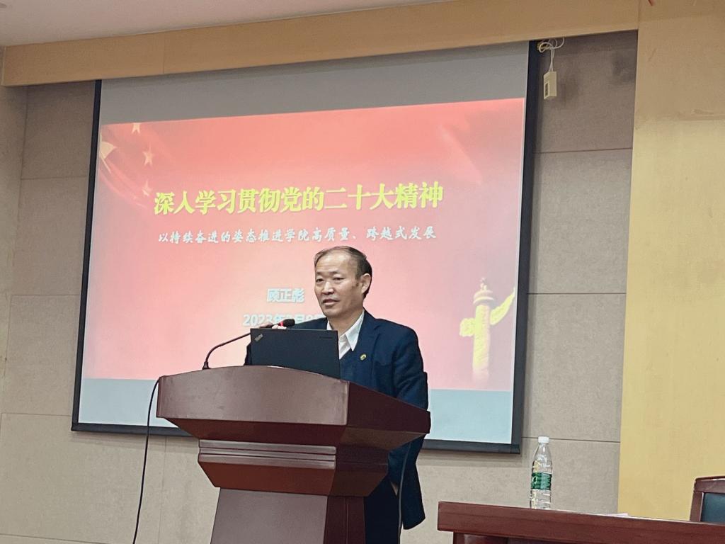 B329会议室举行新学期教职工政治理论学习第一课,校党委常委、副校长顾正彪教授以《深入学习贯彻党的二十大精神,以持续奋进的姿态推进学院高质量、跨越式发展》为题为全体教职工主讲党的二十大精神专题内容。