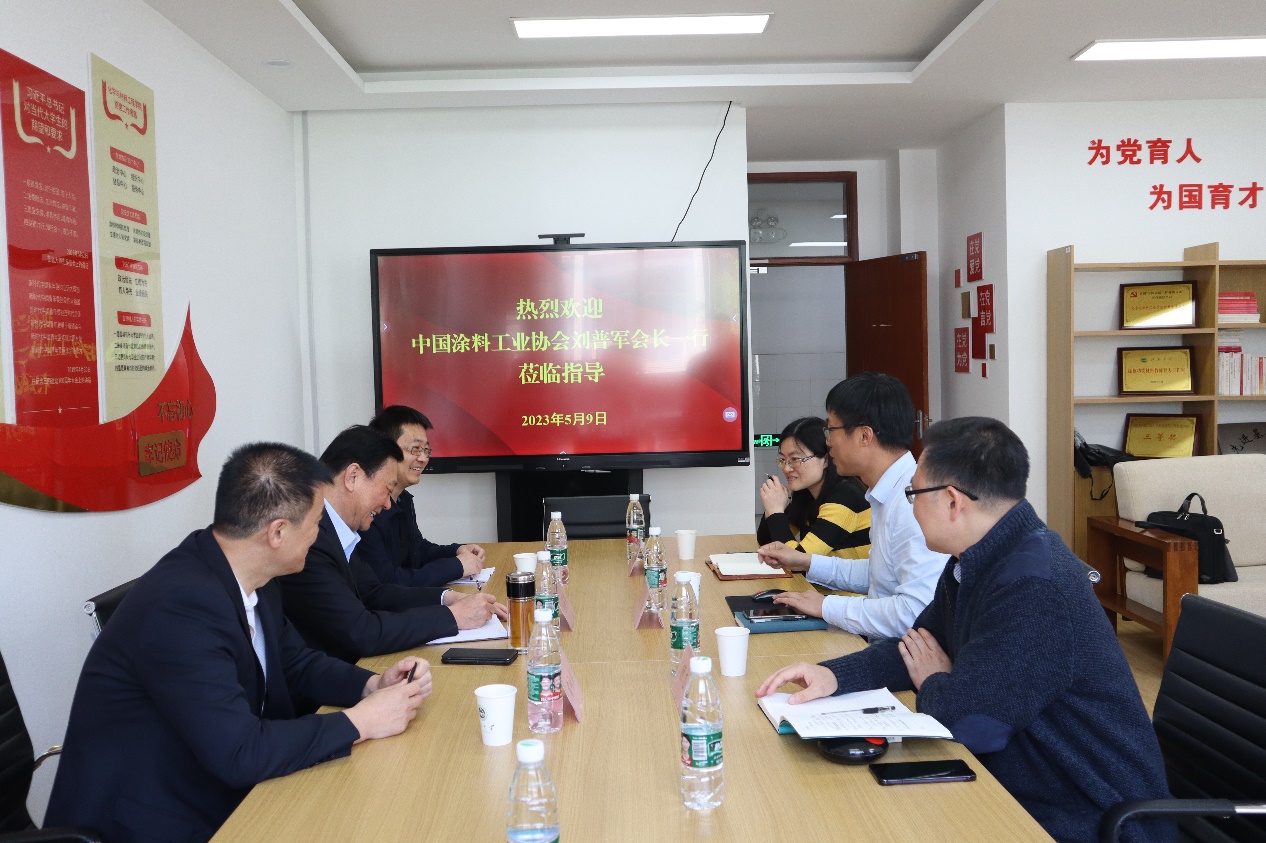 2023年5月9日上午,中国涂料工业协会会长刘普军、副秘书长齐祥昭、办公室副主任赵强和濮阳工业园区招商服务局局长霍向滨一行来院访问交流,院长刘仁教授、副院长顾志国教授及高分子材料与工程系主任罗静教授参会。