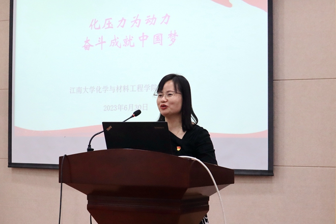 晏晓东同志作为优秀教工党员代表发言。他表示,自己作为应化系党支部的一员有责任有义务不畏艰难,投身化妆品应用研究,将个人梦想融入组织目标,实现共同发展,共同进步。他鼓励同学们志存高远,将个人梦想和民族伟大复兴梦深度融合,把握时代发展趋势,争做时代领跑者。