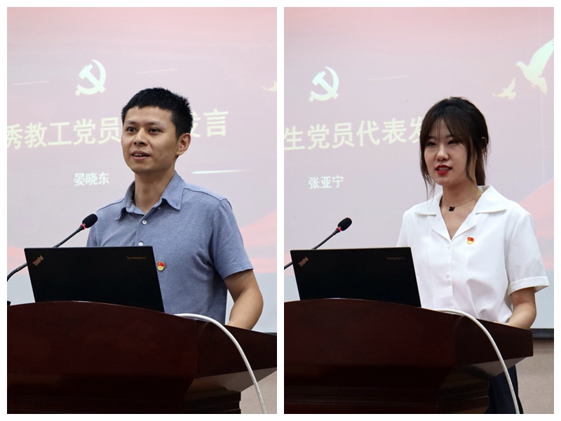 优秀教工党员代表晏晓东、优秀学生党员代表张亚宁发言