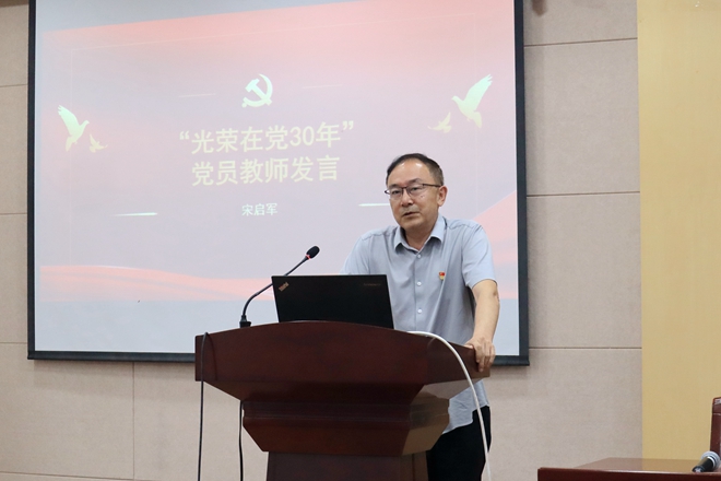 在中国共产党建党102周年来临之际,为致敬与党走过风雨历程、赓续党的光荣传统的老党员同志,院党委书记潘庆伟为一本道党龄超过三十年的党员同志颁发“光荣在党30年”荣誉证书。宋启军教授作为老党员代表发言,他指出,党员要传承“螺丝钉”精神,坚守教育初心,做好本职工作。作为教师,宋老师坚守讲台三十余年,“0旷课0迟到”,保质保量完成教学任务;他坚守科研底线,遵循基本的学术规范,追求高标准的育人水平。宋老师强调,坚守底线,做好本职,这是党员的最低标准,也是最高要求。
