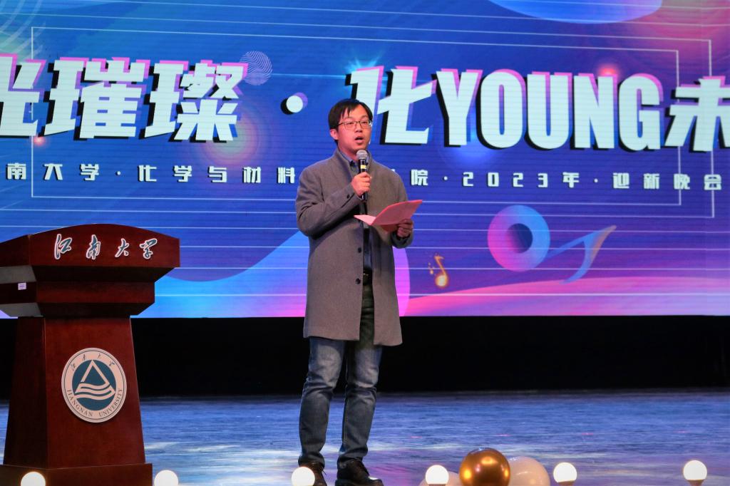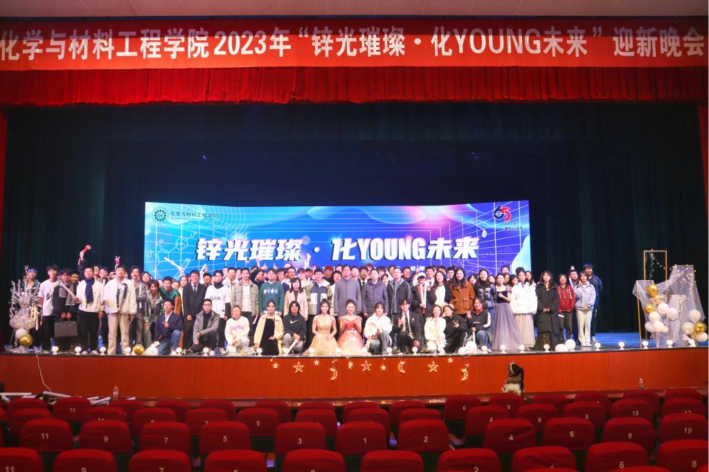 在文浩馆举行2023年“锌光璀璨,化young未来”迎新晚会。学院院长刘仁,党委副书记、副院长董霞,副院长马丕明,学工办主任、分团委书记鞠峰,学工办副主任侯玉莹,辅导员及班主任老师出席此次晚会。